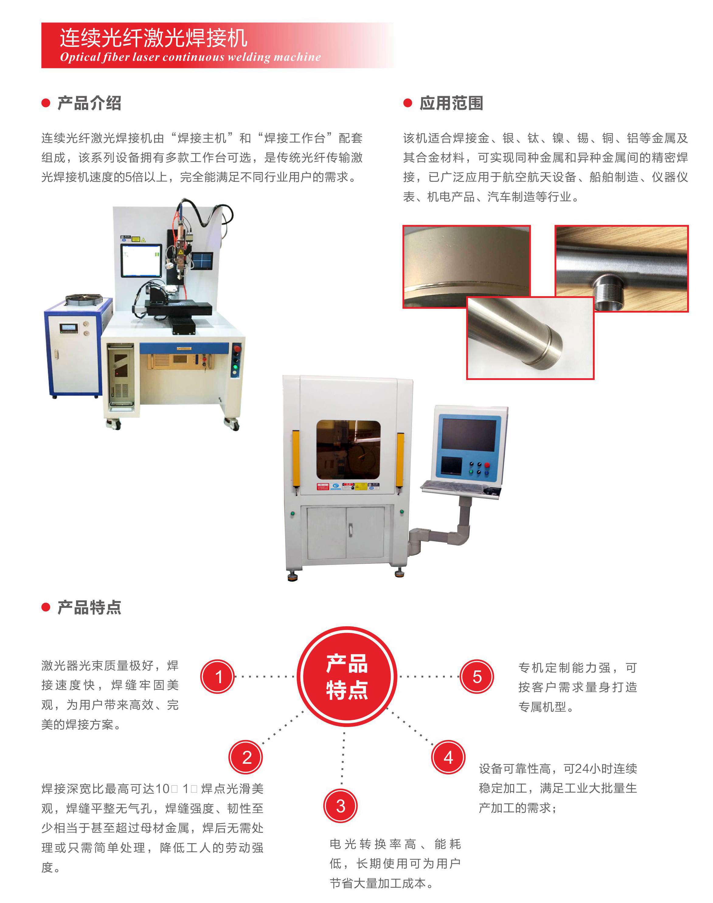 該機適合焊接金、銀、鈦、鎳、錫、銅、鋁等金屬及其合金材料,可實現同種金屬和異種金屬間的精密焊接,已廣泛應用于航空航天設備、船舶制造、儀器儀表、機電產品、汽車制造等行業。